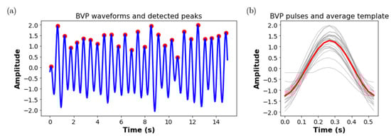 Demonstration of signal quality assessment, (a) A 15s rBVP waveform and detected peaks using proposed approaches, (b) rBVP pulses (gray curves) and the averaged rBVP template (red curves), SQI = 0.94.