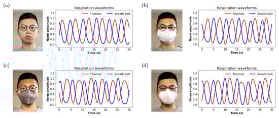 Respiratory signals extracted from thermal video (red) and from a reference breath belt (blue) of a subject at 75 cm with different face masks, (a) No face mask, (b) medical face mask, (c) N90 face mask, and (d) N95 face mask.