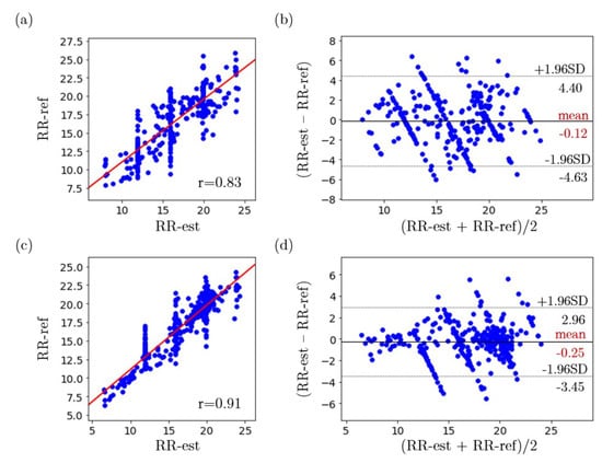 (a) Correlation plot of the estimated RR and reference RR for experiments when subjects were not wearing face masks, (b) Bland–Altman plot of the estimated RR and reference RR for experiments when subjects were not wearing face masks, (c) Correlation plot of the estimated RR and reference RR for experiments when subjects were wearing face masks, (d) Bland–Altman plot of the estimated RR and reference RR for experiments when subjects were wearing face masks.