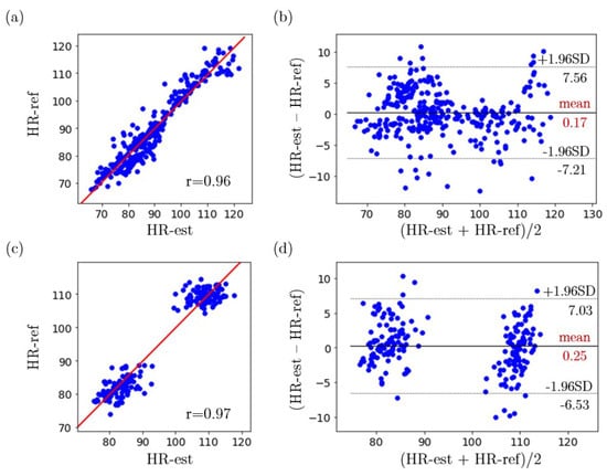 (a) Correlation plot of the estimated HR and reference HR for subjects who have a pale skin tone, (b) Bland–Altman plot of the estimated HR and reference HR for subjects who have a pale skin tone, (c) Correlation plot of the estimated HR and reference HR for subjects who have medium or dark skin tones, (d) Bland–Altman plot of the estimated HR and reference HR for subjects who have medium or dark skin tones.