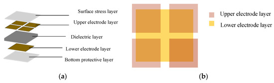 (a) Structure scheme of the proposed capacitive sensor; (b) projection relationship of upper and lower electrode layers.