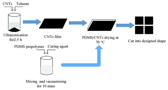Carbon nanotubes (CNTs) were selected as electrode layer conductive materials. The electrode layer preparation process was (Figure 4): first (i) PDMS prepolymer was mixed with a curing agent at the mass ratio of 10:1 and then it was stirred with a glass rod and put into a magnetic mixer for stirring and vacuumizing for 10 min to remove bubbles; (ii) 0.1 g of CNTs were dispersed in 10 g of toluene solvent and then ultrasonically dispersed in an ultrasonic cleaning machine (power: 240 W) for 2.5 h to obtain the carbon nanotube dispersion, and the carbon nanotube dispersion was evenly dripped on the coater at 70 °C until uniform carbon nanotube film was formed; and (iii) the prepared PDMS solution was evenly covered on the surface of the carbon nanotube film and cured at 70 °C, and then the CNTs/PDMS film was peeled from the coating machine and cut into the required shape and size as the electrode layer.