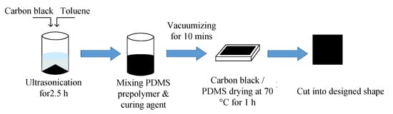 Polydimethylsiloxane (PDMS) with micro carbon black particles inside was selected as the dielectric layer of the soft capacitive sensor. The preparation process of the dielectric layer was (Figure 5): first (i) carbon black with different mass fractions was dispersed in toluene solvent and ultrasonically dispersed for 2.5 h in an ultrasonic cleaning machine to obtain carbon black dispersion solution; then, (ii) PDMS prepolymer was added. The beaker was placed on an electric heating plate and heated at 60 °C until toluene volatilized completely. Whether toluene had been completely volatilized can be judged by the weighing method. The mass ratio of prepolymer to curing agent is 10:1. The curing agent is added in the proportion of 1:1 and is stirred with a glass rod and then put into a magnetic stirrer for 10 min to remove bubbles; then, (iii) it is poured into the mold and put into the blast drying oven. The temperature is set at 70 °C for 1 h of drying. Finally, the carbon black/PDMS composite is cut into the required shape and size as the medium layer. Multi-directional force detection can also be realized by thermal drawing—a very simple method [47,48].