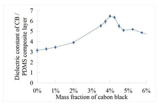 In order to obtain carbon black/PDMS composite dielectric layer with excellent dielectric properties, the capacitance of carbon black/PDMS composite dielectric layer with different mass fractions (0.5 wt%, 2 wt%, 3 wt%, 3.5 wt%, 3.75 wt%, 4 wt%, 4.25 wt%, 4.5 wt%, 5 wt%, and 6 wt%) was measured by LCR bridge. As shown in Figure 7, the test frequency is 100 kHz and the test voltage is 1 V. It can be concluded that the dielectric constant of carbon black/PDMS composite layer increases at 4 wt% and then decreases. The results show that the dielectric properties of carbon black/PDMS composite layer are the best at 4 wt%. In Figure 7, we demonstrate the dielectric constant of carbon black/PDMS composite layers according to the weight concentration of carbon black. The addition amount of the conductive agent follows the percolation theory of the conductive particles in the polymer matrix; that is, the conductive agent reaches the optimal polarization characteristic state in the polymer matrix after addition up to a certain amount, and the dielectric property of the composite material cannot be significantly improved if it continues to be added.