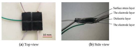 The electrode layer, dielectric layer, and surface stress layer made and cut are placed in alignment, and fixed together by the mixed prepolymer and curing agent of PDMS to obtain the capacitive flexible sensor. The CNT/PDMS film is used as the electrode layer, and carbon black/PDMS composite material is used as the dielectric layer (Figure 8).
