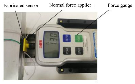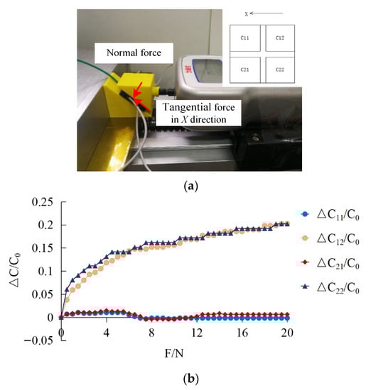 The tangential force is divided into X and Y directions. A push–pull gauge is used to apply pressure to the sensor in X and Y directions, respectively, and output capacitance value under different tangential force is recorded.