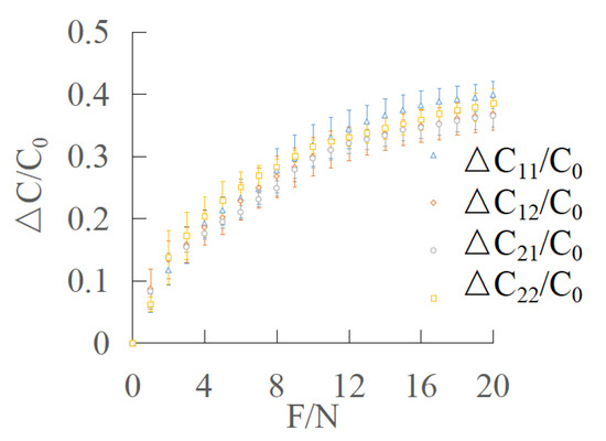 The range of the sensor in Z direction is 0–20 N. The relative change of capacitance between 0 and 9 N is 0.725, so the sensitivity of normal force direction between 0 and 9 N is 0.028 . The relative change of capacitance between 10 N and 20 N is 0.179, so the sensitivity of normal force direction between 10 N and 20 N is 0.0049 .