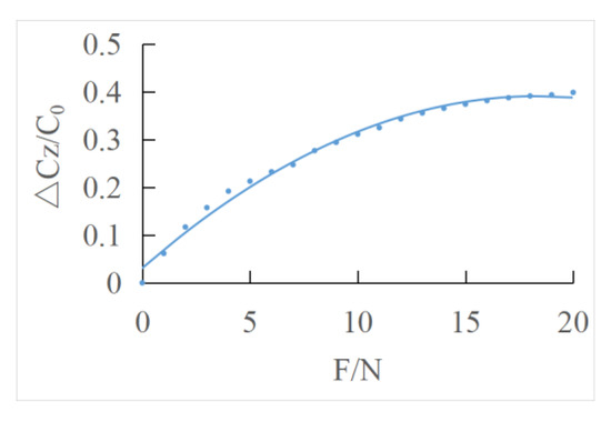 According to Equation (18), the relationship between the normal force and the relative capacitance variation can be obtained when the initial capacitance the initial overlapping area and , are known.
