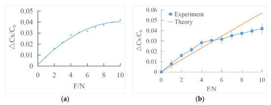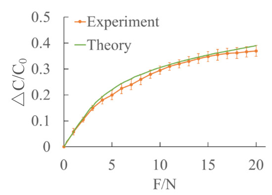 The experimental curve was compared with the theoretical value (Figure 14b). can be represented by according to Equation (30). When the applied force was over about 5 N, there is a significant difference between the experimental and theoretical value, and the measured tangential force becomes lower. The reason might be that when the applied tangential force reaches a certain value, there is a small slide between the interface. Thus, the actual force becomes smaller, which leads to the decrease in the capacitance variance.