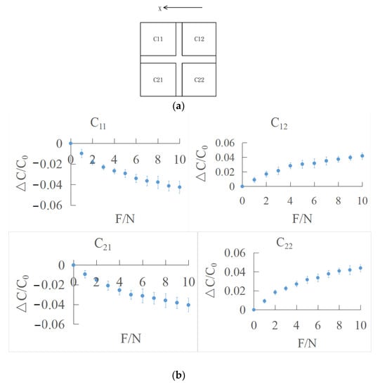 According to Equation (28), when the initial capacitance , initial spacing , elastic modulus E of dielectric layer and Poisson’s ratio are given, the relationship between the magnitude of tangential force and capacitance variation can be obtained (Equation (29)). With the same method, the tangential force in Y direction can be obtained.