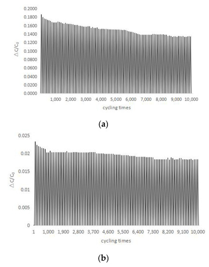 A force of 3 N is applied to the sensor for 10,000 pressure loading and unloading cycles. LCR bridge is used to measure the relative capacitance changes of normal force and tangential force of the sensor (Figure 15); it can be seen that the relative variation of capacitance of the sensor is basically stable. For the normal force, ΔC/C0 decreased from 0.18 to 0.14 after 10,000 cycles. For the tangential force, the ΔC/C0 decreased from 0.023 to 0.018 after 10,000 cycles. The value of ΔC/C0 decreased rapidly in the first 1000 cycles, then it reached a relative stable value after about 7500 cycles, indicating that the sensor has good stability after about 7500 cycles. According to the fatigue performance, compensation ought to be used to obtain the precise value.