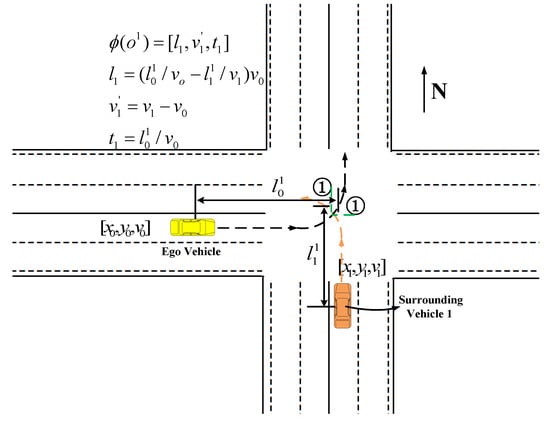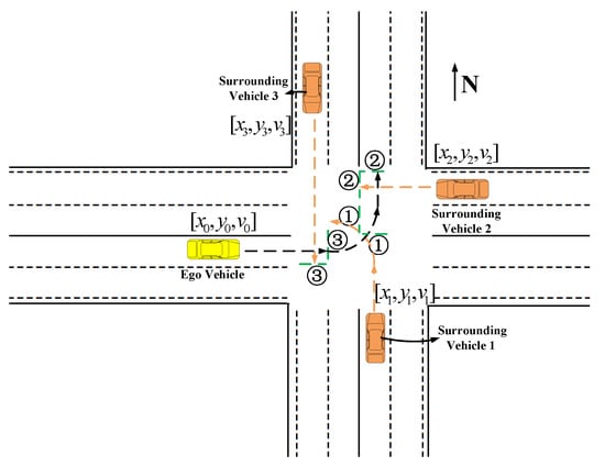 Similarly, the collision relationship between the ego vehicle and other surrounding vehicles is shown in Figure 2. In this case, the input state is a set of the collision relationship . Surrounding vehicles are counted counterclockwise in the stand of ego vehicle: the south surrounding vehicle is 1, the east surrounding vehicle is 2, and the north surrounding vehicle is 3. The dashed green lines ①, ②, ③ are the corresponding collision disappearance boundaries.