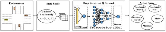In this section, the collision relationship between an intelligent land vehicle and surrounding vehicles is designed as the input of CR-DRQN. Then, CR-DRQN is utilized to determine the best strategy for driving behavior decision-making. The design of the decision-making model and the structure of CR-DRQN are described as follows.