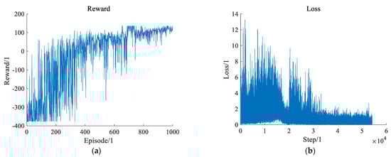 Training process based on CR-DRQN. (a) presents the change of the reward obtained by the intelligent vehicle with the increase of episodes. (b) presents the relationship between the loss and update steps.