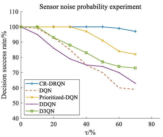 When the environment is partially observable on account of sensor noise, the observed states exhibit hysteresis and are different from the environmental states. In this case, there is no collision risk warning from the state input, but collision risk exists. Because of weak abilities to predict risks, DQN, Prioritized-DQN, D3QN, and DDQN are highly dependent on the accuracy of environmental perception. Therefore, the success rates of decisions are greatly affected by perception error owing to the sensors. Nevertheless, CR-DRQN trains time series so that the ability of risk prediction is stronger than the other four algorithms. Although the environment is perceived with different levels of noise, the success rate of CR-DRQN decision-making is slightly affected. The decision-making performance of CR-DRQN in a partially observable environment is superior to DQN and its variants. That is, the probability of decision failure is greatly reduced in the condition of sensor noise.