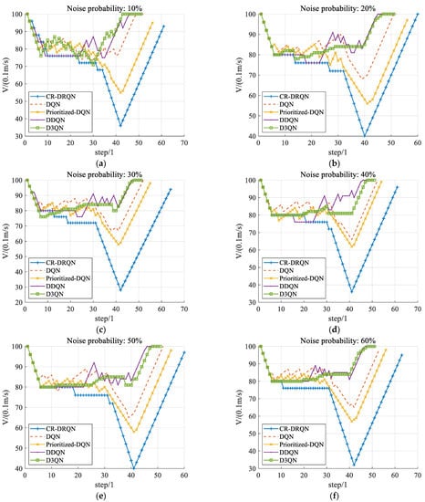 The ability to predict collision risk has a significant impact on decision success. This ability is reflected by the velocity change of the ego vehicle. The velocity of the ego vehicle is recorded from the above safety evaluation experiments. In those experiments, decisions of DQN, Prioritized-DQN, DDQN, D3QN, and CR-DRQN are successful. As shown in Figure 6, with different probabilities of noise occurrence, the velocity of the ego vehicle slows down before an intersection because it is affected by the safety reward Rsafe. When surrounding vehicles leave the intersection, the ego vehicle accelerates to maximum velocity under the influence of Refficient until the episode ends. In Figure 6, although DDQN is aware of dangers ahead, deceleration action is brief. Then DDQN speeds up soon. This demonstrates that DDQN has a poor ability to avoid a secondary collision. Moreover, the result of D3QN is like DDQN. The intelligent land vehicle decelerates to about 8 m/s first but the deceleration is brief. This illustrates that D3QN has a poor capability to avoid second collisions, too. In addition, in the first 4 s, the velocity of the ego vehicle based on CR-DRQN drops to approximately 4 m/s while the velocities of DQN and Prioritized-DQN are approximately 7 m/s and 6 m/s, respectively. This shows that the deceleration of DQN and Prioritized-DQN are less than CR-DRQN in the first four seconds. Thus, the ego vehicle keeps a higher velocity based on DQN and Prioritized-DQN before the intersection. However, it is too difficult to avoid a collision with high velocity. To conclude, both DQN and Prioritized-DQN have weak abilities of collision risk prediction. On the contrary, an intelligent land vehicle based on CR-DRQN can drive through an intersection safely with lower velocity before an intersection. This verifies that CR-DRQN’s ability to detect collision danger is more outstanding than other algorithms. That is also why CR-DRQN’s decision-making success rate is higher.