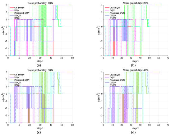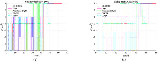 Here, the comfort of decision-making is tested by the frequency of acceleration change. The acceleration of an intelligent land vehicle is recorded from the above safety evaluation experiment with successful decisions. Acceleration curves with decision steps under different probabilities of noise occurrence are shown in Figure 7. This shows apparently that the acceleration fluctuation of CR-DRQN is smoother than other algorithms at different probabilities of noise occurrence. The velocity control of CR-DRQN is more stable; thus, driving comfort is enhanced.
