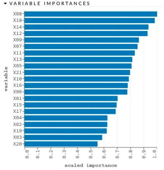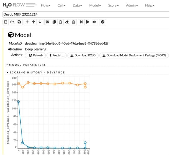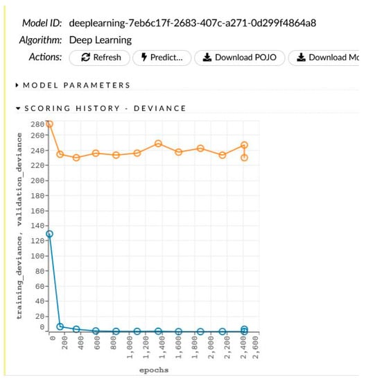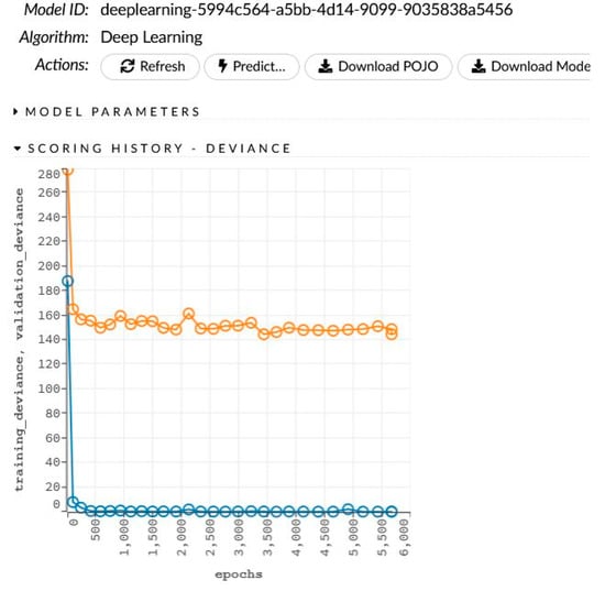The process of generating a neural model was carried out using H2O.ai. software (version 3.24.0.5) with Deep Learning methods, which allows us to create, validate, and predict artificial neural network models. In this software, it is also possible to perform a sensitivity analysis of variables of the developed models [,,]. Deep learning is a class of machine learning methods for hierarchical (deep) models with nonlinear layers []. The idea of deep learning is to pretrain the network, and in the next step to train the network in a supervised manner—this method can combine supervised and unsupervised learning. In order to carry out the learning process properly, a large dataset is usually required; however, this is not necessary due to the deep neural network’s performance, which has the ability to redundancy. In brief, it can be said that the network “breaks” data into smaller parts and, on the basis of these smallest elements, aims to generalize the processed information.