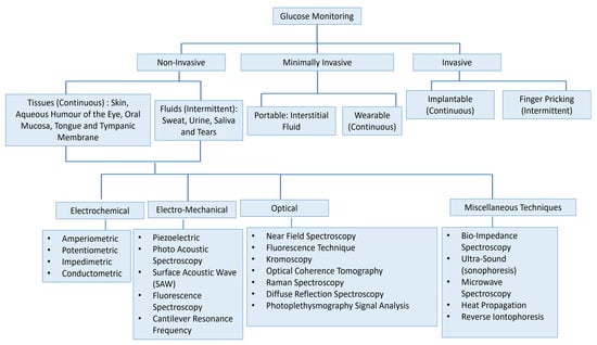 Figure 1 presents the vast field of glucose measurement techniques and distinguishes three different categories: invasive, minimally invasive, and non-invasive approaches. Minimally Invasive (MI) technologies are those that need to extract some form of fluid from the body (i.e., tears, saliva, sweat, and interstitial fluid (ISF)) to measure the glucose concentration through an enzymatic approach. In invasive monitoring, there is direct detection of glucose in the blood. In noninvasive or at least minimally invasive methods, biological fluids are obtained which contain glucose at concentrations that correlate with that in blood. Because of this correlation, these alternative biofluids have become novel analytes of interest for the painless monitoring of glucose in the body.