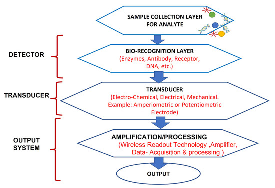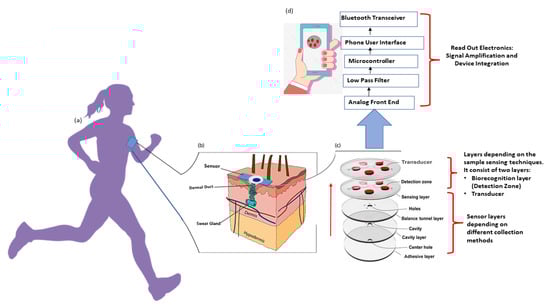 In past years, wearable biosensors have spurred new developments in many innovative technologies in several domains, from environmental to biomedical. Wearable biosensors have the potential to provide continuous, real-time physiological information via dynamic, noninvasive measurements of biochemical markers in biofluids, such as sweat, tears, saliva, and interstitial fluid. These sensors can measure analytes that are extremely crucial to rapidly monitor changing biological fluids in real time. It comprises of an element of a biological recognition layer in the sensors which may interact particularly with a target molecule and a transducer that can convert this interaction into a measurable signal. The presence of a biological element (to be analyzed) and its easy availability under normal conditions are the basis of any biosensor. Sweat-based sensors rely on sweat’s ready availability and easy collection process to facilitate providing the particular bioanalyte for further detection and amplification. In wearable biosensors, numerous known components such as receptors, nucleic acids, cells, and several types of enzymes are used. These are the foundation blocks for creating and characterizing biosensors that use optical, colorimetric, or acoustic sensing principles. The working of these biosensors is explained in Figure 2. Sample containing the target analytes is collected through various mechanisms, which, in case of sweat, may take the form of a microfluidic mechanism. A bio-recognition layer performs the detection of the target analyte in the presence of many. A transducer layer converts the detector response to a measurable response, and subsequently, the result is presented via the readout system, wirelessly elsewhere or locally.