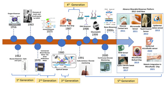 Due to the advent of nanotechnology in the late 1990s, a wide range of nanomaterial-based biosensors have been developed that make use of the appealing qualities of various nanomaterials, such as silicon and gold nanoparticles, for label-free and amplified biosensors, respectively, starting the fifth generation of the Advanced Wearable Biosensor Platform. A number of distinct DNA biosensors were developed in the late 1990s [24]. This led to significant advancement in biosensor technology over the last few years, paving the path for wearable biosensors. These subcutaneously implantable glucose sensors moved in the early 2000s to commercial wearable biosensors that track the real-time glucose level in the ISF, along with diabetes-relevant trends and patterns. A brief representative history of BG monitoring techniques is shown in Figure 3. As can be seen in the figure, the trend has always been towards noninvasive and continuous glucose monitoring. Today, sweat-based glucose sensing is the top contender there, though wearable optical methods are also very interesting, having similar benefits except for the technological challenges of some underlying mechanisms.