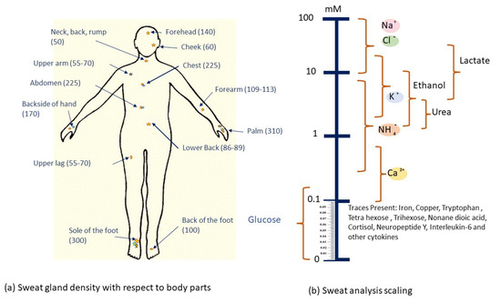 (a) The average sweat gland density illustration (glands/cm) on different areas of the body [57,58]. (b) Scale illustrating the approximate range of levels for several sweat analytes reported in [59,60,61,62,63].