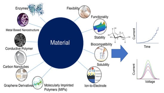 Non-biological catalysts have recently gained a lot of interest for glucose detection since, they can successfully solve all the limitations of first- to third-generation wearable glucose sensors as discussed previously in Section 2. The new technology resulted in the development of a new class of glucose sensors known as enzyme-free or fourth-generation glucose sensors. Various conducting materials have been used to develop the electrodes of the wearable sweat glucose sensor or detecting layers on the basis of sensor type.