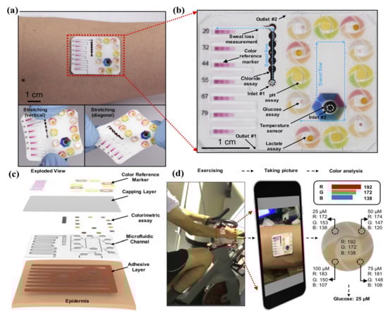 - Koh, A.; Kang, D.; Xue, Y.; Lee, S.; Pielak, R.M.; Kim, J.; Hwang, T.; Min, S.; Banks, A.; Bastien, P.; et al. A soft, wearable microfluidic device for the capture, storage, and colorimetric sensing of sweat. Sci. Transl. Med. 2016, 8, 366ra165. [Google Scholar] [CrossRef]