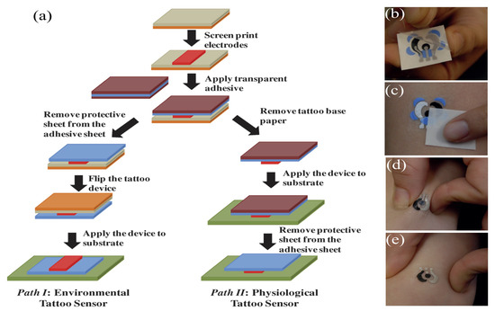 (a) The screen-printed electrochemically based tattoo, (Path I) for environment, (Path II) for analyte monitoring. Image (b) shows the clear protective sheet is removed, and in (c) the tattoo base paper is softly applied on human skin after dabbing with water for tattoo appliances. Image (d,e) illustrates the level of mechanical stress and strain that a tattoo is used to twist the underlying skin on a human subject. The figure concept adapted from [111,117].