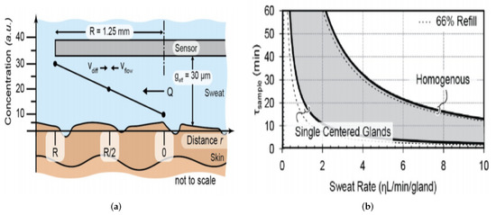 Unlike other unobtrusively accessible biofluids such as tears, urine, and saliva, sweat is more suitable for health monitoring. Tears can only be sampled once in a while, urine cannot be continuously accessed, and saliva cannot be used. Furthermore, saliva-based sensing may not be particularly accurate or very reliable as it is affected by the last meal the person had eaten [66]. Sweat-based sensing, however, suffers from often unknown correlation between the biomarkers present in sweat and those present in blood, considered the gold standard. While precise sweat-based detection is a challenging task, it is considered as an ideal candidate for continuous or semi-continuous monitoring over a prolonged period. This information can directly lead to detecting several pathologies. These sweat sensors can be placed in close proximity to sweat-generating sites, which allows for a fully wearable device with minimal sample degradation [67,68]. An analyte such as glucose is also present in the sweat, so using appropriate sweat collection method every several minutes, one can generate useful information about the level of glucose in the system.
