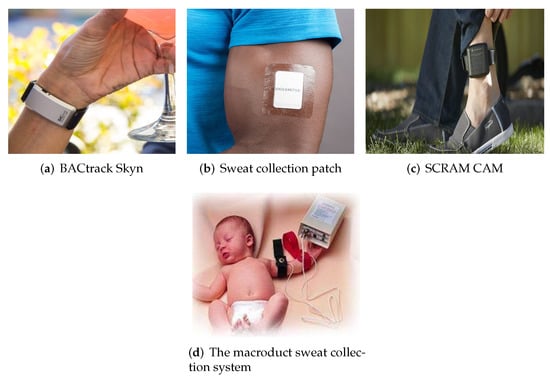 Although these research works achieved promising results in SG sensing accuracy, there are a few obstacles to overcome, such as real-time signal correction, long-term stability for continuous monitoring, and also the reproducibility between sensors and various patients and customized wireless electronics. The possible options for direct glucose monitoring include body fluids such as sweat, saliva [44], and tears [45]. The glucose density is 1 to 10 per cent of the blood density in these fluids. The long-term view is to develop sensors for integration in wearables such as clothing [46,47], bracelets [48,49,50], patches [51,52], and tattoos [39,41,53], which can sample a number of body indicators continuously. Some examples are given in Figure 4.