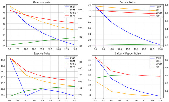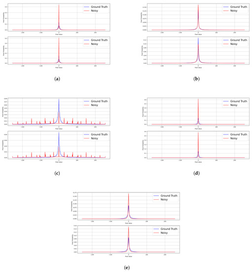 Reference [49] showed that natural images exhibit a generalized Gaussian curve when taking the pixel count of the derivative of the image. Reference [49] used this property to perform image deblurring by curve fitting using the K number of the Gaussian distribution, while [50] used a piecewise function to model the image gradient property of natural images. This property inspired us to observe image information in a statistical viewpoint, and we observed that different noises will result in different image gradient responses. Instead of sacrificing the accuracy, we adopted a full-reference approach, which requires the input of a ground truth image to be used as a reference.