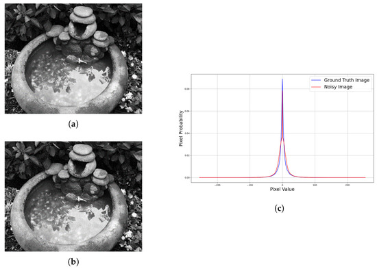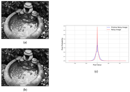 Ground truth–noisy image pair with their respective image gradient statistics. The image gradient statistics are very close to each other, which are similar to the original image, but the features are clearly described through the image gradient statistics. (a) Ground truth image. (b) Noisy image. (c) Image gradient statistics along the X-axis.