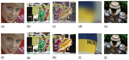 Corruption from the LIVE dataset. The corruption is performed on the entire image. The cropped noisy and ground truth pair image is shown in (a–j). The noisy image is in (a,b), while (f–j) is the respective ground truth image. The noisy images consist of (a) JPEG2000 compression, (b) JPEG compression, (c) white noise, (d) Gaussian blur, and (e) the fast-fading Rayleigh channel.