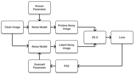 We used the Kodak image dataset to perform the evaluation of the estimated noise parameters. We classified the conducted test into four types of distortion estimations: additive noise estimation, multiplicative noise estimation, impulsive noise estimation, and combined noise estimation. The Kodak images consist of natural images that have a size of 768 × 512 or 512 × 768. We resized the images to 192 × 128 or 128 × 192 depending on the original image size. We used Particle Swarm Optimization (PSO) to estimate the noise parameters. To prevent heavy oscillation, we adopted a batch mean strategy by taking the mean loss of 20 noisy image batches. The overall algorithm is shown in Figure 8. In real-life usage, the pristine noisy image is the noisy image in the ground truth–noisy image pair instead of noise injection into the clean image.