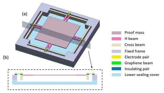 As shown in Figure 1a,b, the accelerometer consists of a proof mass, resonant components, and fixed frame with central hollows. The resonant components include transmission beams, electrode pairs, insulator pairs, and graphene bands. The proof mass in the center is supported by four groups of transmission beams and suspended, which overcomes the friction between the fixed frame and the proof mass. Each group of transmission beams consists of an H beam and a crossbeam. One end of the H beam is connected with the center of the crossbeam, while the other end is connected with the proof mass, and the upper surfaces of these two beams are in the same horizontal plane to facilitate etching. The thickness of the crossbeam is usually larger than that of the H beam, so that the lateral displacement of the crossbeam introduced by the gravity of the proof mass and transmission beams is too small to be considered. The main structure of the accelerometer is formed by etching of a double-sided polished silicon wafer and then the main body and sealing covers are closely combined by the bonding process of the silicon wafer [18,19]. The crossbeam, H beam, and the central proof mass are located in a straight line, so that the whole accelerometer is symmetrical along two axes to avoid off-axis disturbance of acceleration. Four pairs of silicon dioxide layers or other insulating layers are covered at the central position on the crossbeam and the fixed frame. Then, four monolayer or few-layer graphene tapes are transferred to the corresponding insulating layers through the micro-nano transfer platform. The electrode pairs are formed at both ends of four graphene tapes by sputtering metal, and the graphene tapes are fixed at the same time. Finally, the accelerometer is sealed in a vacuum environment by bonding with the upper (not drawn) and lower sealing cover and vacuuming [20]. The resonant frequency can be actuated and detected by electrostatic [21] or optical [22] schemes. When using electrostatic excitation and detection schemes, the electrodes at both ends of graphene serve as source and drain, respectively, while the crossbeam is used as gate. All of them are connected with the external detection circuit by setting signal leads on the upper sealing cover. When using the optical excitation and detection schemes, the upper sealing cover is made of glass or other transparent materials.