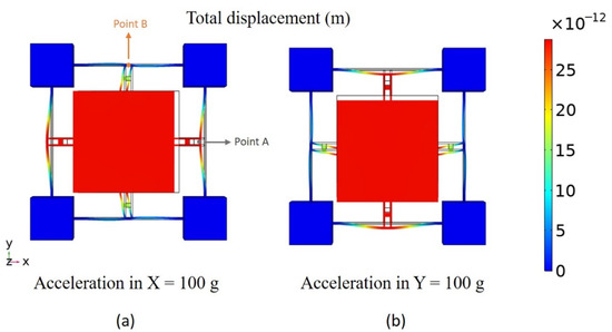 The total displacement diagram of the accelerometer with the acceleration of 100 g along the positive X axis (a) and the positive Y axis (b), respectively. The fixed frame of the accelerometer is simplified.