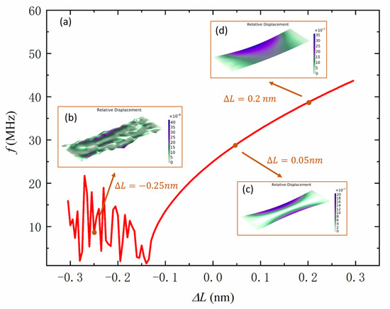 In order to improve the sensitivity of acceleration measurement, a pair of graphene resonant beams working in a differential state are placed on each axis. The inertia force produced by axial acceleration stretches one graphene beam while it shrinks the other at the same time, resulting in reverse resonant frequency shifts of these two graphene beams. Graphene has a fracture strength up to 42 N/m [23], so it can withstand large acceleration without fracture. Figure 3a shows the resonant frequency of a graphene beam with a fixed edge of and unfixed edge of when the graphene beam is stretched or contracted. When stretched, the resonant frequency rises with the increasing stretching length, and there is a linear region close to the origin. With the further increase of the stretching length, the growth of the resonant frequency becomes nonlinear, and the growth rate decreases continuously. Figure 3c,d shows the resonant modes of graphene beams with a stretching length of 0.05 and 0.2 nm, respectively, and their corresponding strains are and . The resonant mode of graphene is symmetrical with weak stretch, but with the increase of the stretching strength, the maximum amplitude appears on the free edge of one side, which is called edge mode [24]. However, the change of the resonant mode does not affect the continuity of the resonant frequency with the stretching length. When the graphene beam shrinks, the resonant frequency decreases with the increasing shrinking length. Additionally, the resonant mode is similar to that in Figure 3c, which is not shown in the figure. With the further increase of the shrinking length, buckling of graphene occurs. At this time, the calculation result of the resonant frequency is imaginary, and its absolute value also changes irregularly. As shown in Figure 3b, the resonant mode is singular as well. The resonant frequency no longer directly reflects the shrinking length, which means the measurement of acceleration is invalid.