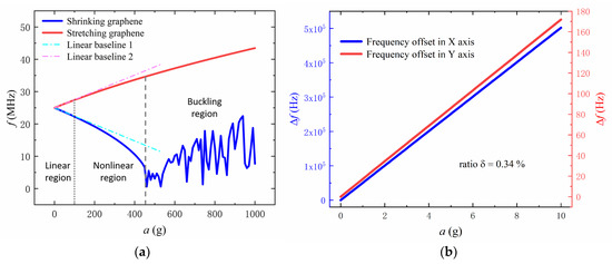 The initial size of the accelerometer is shown in Table 1. With certain parameters of the accelerometer, quantitative analysis of measurement performance can be performed. Figure 4a shows the change of the resonant frequency of a pair of differential graphene beams corresponding to the acceleration along the same axis. When the acceleration is small, the increase of the resonant frequency of the stretching graphene beam can be regarded as linear, while the resonant frequency of the shrinking graphene beam decreases linearly, which is called the linear region. We define a linear region with a linear deviation of no more than 0.5%. Based on this, the linear range is 0–89 g with an acceleration step of 1 g. Using graphene as a harmonic oscillator will lead to a higher level of scale factor nonlinearity than silicon. The nonlinear scaling factor of a silicon-based accelerometer is usually dozens [26,27], but for shrinking graphene, the nonlinear scaling factor can reach hundreds or even thousands. Therefore, it is very important to further develop the measurement of acceleration in the nonlinear region in order to expand the application range of the graphene accelerometer. In the nonlinear region, with the rise of acceleration, the decreasing rate of shrinking graphene increases, while the increasing rate of stretching graphene decreases. When the acceleration is greater than 460 g, buckling of graphene occurs, which is called the buckling region. Thus, the critical buckling acceleration is 460 g. Additionally, the sensitivity of shrinking graphene in the linear region is 25,591 Hz/g, and that of stretching graphene is 25,328 Hz/g after calculation. Therefore, the differential sensitivity of acceleration is 50,919 Hz/g, which belongs to the ultra-high sensitivity accelerometer [16]. In order to calculate the cross sensitivity of the accelerometer, the resonant offsets of graphene in the X axis and Y axis were calculated, with the acceleration along the X axis. As shown in Figure 4b, the cross sensitivity of the accelerometer is 0.34%. In addition, with acceleration along the X axis, it will also lead to a tiny non-axial displacement of one end of the graphene in the X axis. However, since the displacement is very small compared with the axial displacement, and the sensitivity of the resonant frequency to the non-axial strain is much lower than the axial strain, this displacement can usually be ignored in the calculation (the frequency deviation does not exceed when the acceleration is within 100 g).