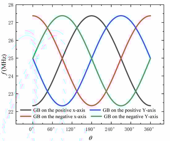 The resonant frequency of the four graphene beams (GBs) in the orthogonal axis varies with the angle between the acceleration and the positive X axis with acceleration of 100 g.