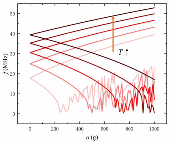 The biaxial accelerometer can also measure the direction of the acceleration in the plane [31]. Since the acceleration in the orthogonal axis is measured independently, the direction of the acceleration can be obtained by vector calculation. Figure 5 shows that the resonant frequencies of the four graphene beams in the orthogonal axis vary with the angle between the acceleration and the positive X axis when the absolute value of acceleration is 100 g. It can be seen that the resonant frequency of these four graphene beams has different trends with the change of the angle; thus, by detecting the resonant frequencies of these four graphene beams, the magnitude and direction of the acceleration in the plane can be obtained quickly and accurately.