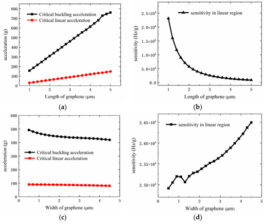 In addition, the effect of the graphene size on the performance of acceleration measurement was also studied. To make the results intuitive, we extracted the critical buckling acceleration and critical linear acceleration from the acceleration–frequency curves, and calculated the acceleration sensitivity of the shrinking graphene beam in the linear region. The variation of the above parameters with the length (free edge) of the graphene beam is shown in Figure 7a,b. With the increase of the length, both the critical buckling acceleration and critical linear acceleration rise approximately linearly, but the increasing rate of the critical linear acceleration is slower than that of the critical buckling acceleration. The sensitivity of acceleration decreases exponentially with the increasing length, so reducing the length of graphene can effectively increase the sensitivity of acceleration measurement. As shown in Figure 7c,d, the width (fixed edge) of graphene has a much weaker effect on measurement performance than the length. Additionally, the variation trend of the acceleration range and sensitivity with the width is opposite to that of the length.