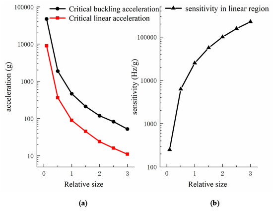 Secondly, the size of the proof mass and transmission beams affects the measurement performance of acceleration by changing the corresponding stretching and shrinking length of the graphene under acceleration. Since the relative size of each structure was designed considering the independence of measurement and avoiding off-axis crosstalk, we only studied the synchronous magnification or reduction of these structures. We studied the measurement performance of the accelerometer in the range of 10 times reduction to 3 times magnification based on the original size, and the results are shown in Figure 8. It was found that the critical buckling acceleration and critical linear acceleration are greatly affected by the size. When the size is reduced by 10 times, the critical buckling acceleration is increased 100 times to nearly g, which can meet the requirements of acceleration measurement in extreme environments, such as high-speed impact [37]. At this time, the sensitivity is on the order of hundreds Hz/g. However, the etching accuracy should reach 100 nm or even 10 nm, which requires a high level of fabrication technology and can be achieved by electron beam lithography or extreme ultra-violet lithography [38]. When the relative size is enlarged by 2 times and 3 times, the corresponding acceleration sensitivity increases by nearly 4 times and 9 times, respectively, which is approximately quadratic increasing. Therefore, changing the size of the force transfer structure is an effective method to improve the acceleration measurement performance.
