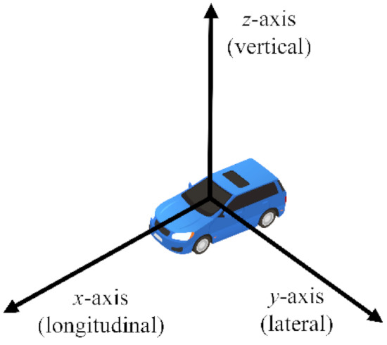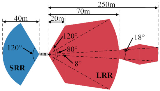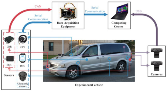 In order to acquire the dataset suitable for the training and verification of the ADB recognition method based on ensemble learning, an integrated experimental vehicle for driving behavior and safety was constructed. As shown in Figure 1, the integrated experimental vehicle consists of the sensors, the data acquisition device, the cameras, the computing center, and the experimental vehicle. The functions of each component of the integrated experimental vehicle are shown in Table 1. The sensors used in the integrated experimental vehicle include long range radar (LRR), short range radar (SRR), inertial measurement unit (IMU), global positioning system (GPS), and an ultrasonic sensor. The functions and installation positions of the above sensors are shown in Table 2. The detection range of the LRR and SRR are shown in Figure 2. The coordinates of the IMU are shown in Figure 3.