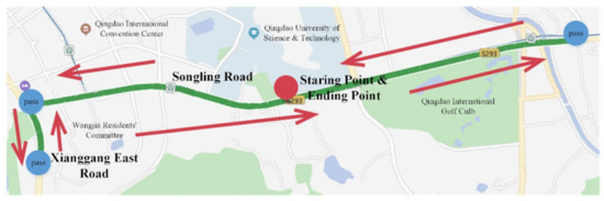 Six consecutive weeks of real vehicle experiment was conducted based on the integrated experimental vehicle for driving behavior and safety. The real vehicle experiment was conducted on one working day and one non-working day every week, and the data acquired every day included the data in rush hour and non-rush hour. Sixteen drivers were selected, including thirteen males and three females, to take part in the experiment. The age distribution of the drivers was between 23 and 50 years, and the average age was 28.9 years old. The driving age distribution was between 2 and 20 years, and the average driving age was 5.3 years. As shown in Figure 4, the road sections of Songling Road-Xianggang East Road in Laoshan, Qingdao were selected as the real vehicle experimental route. The route is a two-direction six-lane urban road with a total length of about 12 km.