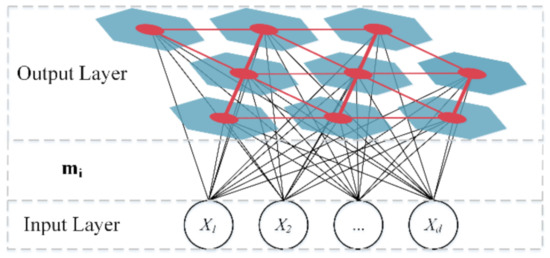 In the dataset balancing, the majority class data is divided into multiple groups, and each group of data is combined with the minority data to form multiple class balance datasets. Therefore, a clustering-based dataset balancing method is utilized [45], aiming to make the divided groups of majority class data have a similar amount to the minority class data in the dataset, and make the difference of the data within each group smaller. In this research, the self-organizing map (SOM) [46] is used to cluster the majority class data. SOM is an unsupervised learning neural network method that can map the high-dimension data to low-dimension space and is widely used in various fields, such as emotional intelligence [47], big data analysis [48], water quality assessment [49], and fault prediction [50]. The basic structure of SOM is shown in Figure 6. The output layer of SOM consists of a two-dimensional regular grid of neurons, and each neuron is represented by a weight vector , , where is the dimension of the input data, and is the number of SOM neurons. In the clustering, SOM assigns the input data to the nearest neuron and updates the weight vector to minimize the distance of the data in the same neuron.