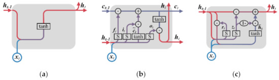 (a) The structure of RNN; (b) the structure of LSRM; (c) the structure of GRU.