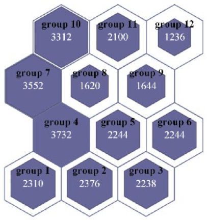 In the dataset balancing, the NDB samples in the training set are divided into multiple groups, and the number of NDB samples in each group should be as close as possible to the number of ADB samples in the training set. Therefore, according to the ratio of the ADB samples to the NDB samples in the training set, the number of SOM neurons is set as 12, and the mapping size is set to 4 × 3 after several tests. After the clustering, the NDB data in the training set are divided into 12 groups. As shown in Figure 10, the white numbers in grids represent the number of NDB samples in the group. The size of the purple shape in the grid is proportional to the number of NDB samples in this group. By combining the 12 groups of the NDB samples with the ADB samples in the training set, 12 groups of class relative balance datasets are obtained.