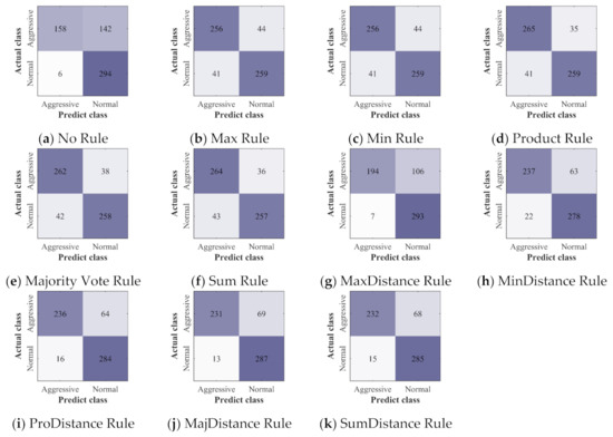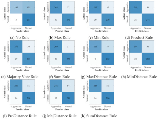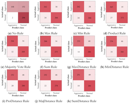 The confusion matrices of CNN: (a) the confusion matrix of the classifier built without ensemble learning; (b–k) the confusion matrices of ensemble classifiers built with 10 different ensemble rules.
