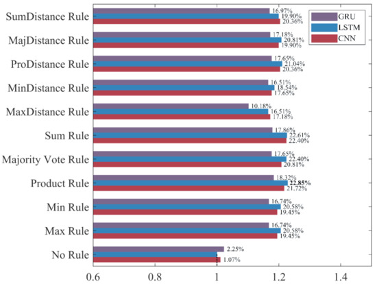 Among the 10 ensemble rules, the Product Rule has the highest improvement to the LSTM and the GRU. Compared with the LSTM and the GRU classifiers built without ensemble learning, the increase rate of the F1-score for the LSTM and the GRU ensemble classifier based on the Product Rule are 39.69% and 34.88%, and the LSTM ensemble classifier based on the Product Rule achieves the highest F1-score of 90.42%. The Sum Rule achieves the highest improvement to the CNN. Compared with the CNN classifier built without ensemble learning, the increase rate of the F1-score for the CNN ensemble classifier based on the Sum Rule is 39.07%. Compared with the other ensemble classifiers, CNN, LSTM, and GRU ensemble classifiers based on the MaxDistance Rule achieves higher precision and lower accuracy, recall, and F1-score, and have the worse performance in the recognition of ADB. Overall, ensemble learning significantly improves the recognition performances of the three deep learning methods for ADB. The LSTM ensemble classifier based on the Product Rule with the highest F1-score of 90.42% achieves the best performance for ADB recognition, followed by the LSTM ensemble classifier based on the Sum Rule. However, most of the ensemble classifiers built based on ensemble learning have a slight decrease in precision, which means that their recognition performance for NDB has decreased.